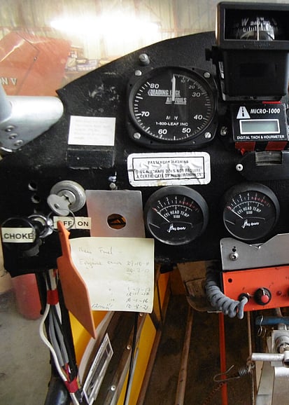 Instrummentation - air speed indicator, rev counter, altimeter, compass, choke, intercom, ignition switch, 2 times cylinder temp gauges, dual gas / temp